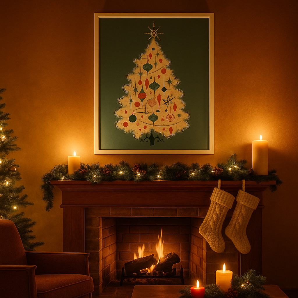 Mid-Century Christmas Tree Framed Wall Art – Retro Holiday Print (Ready to Hang · 8x10 · 16x20 · 24x36)